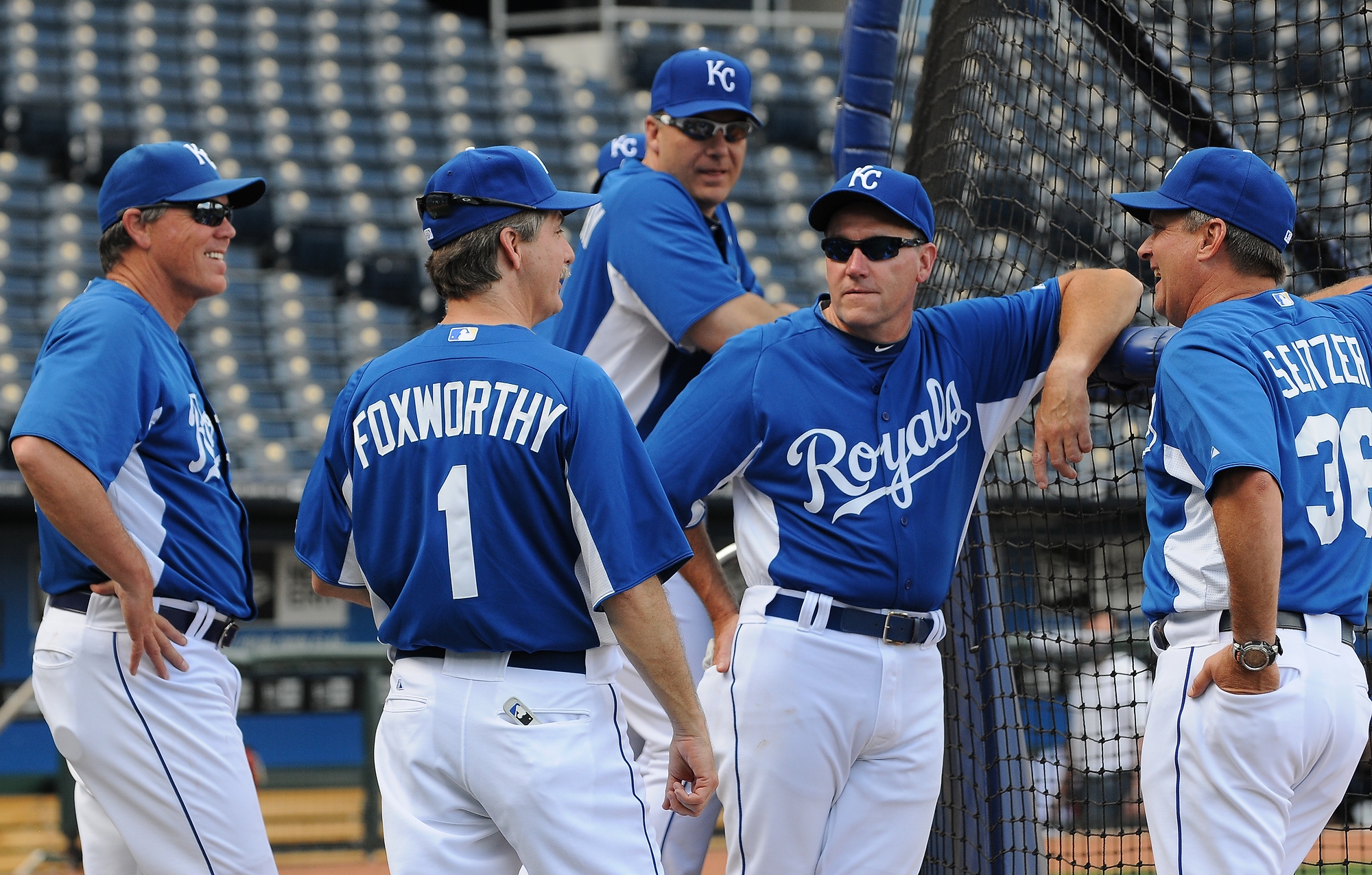 Jeff Foxworthy, good friend of Royals Manager Ned Yost , mixes it up with the Royals coaching during batting practice (6/21/11).